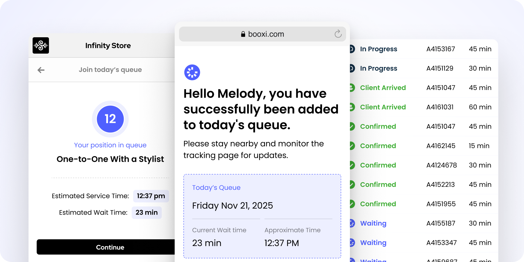 Booxi instantly detects when a store associate becomes available and automatically assigns them the next customer in the queue. The result: a continuously flowing line, fully optimized staff utilization, and no idle moments slowing down the in-store experience.